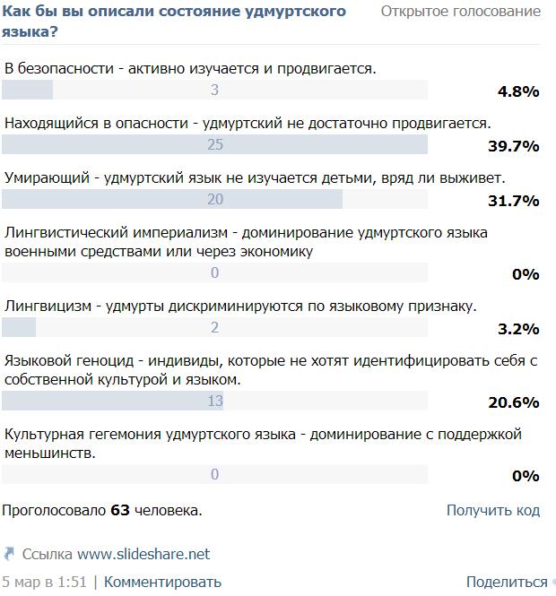 С другой стороны, такой интернет-инструмент как голосования и опросы также позволяют исследовать общественное мнение и отношение к тому или иному явлению. В качестве примера приведем данные опроса, проводимого в группе Удмуртлык сайта ВКонтакте.