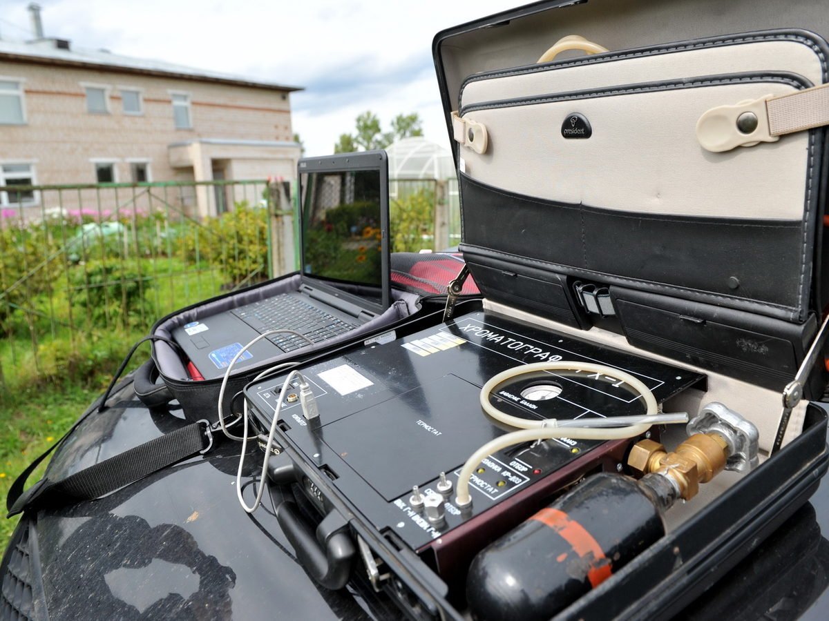 Воздух собирают с помощью хроматографа. Он подключен к ноутбуку, на экране которого отображаются все этапы исследования. Пожужжав, прибор закачивает в баллон необходимое для анализа количество воздуха и затем в течении 40 минут анализирует его состав.