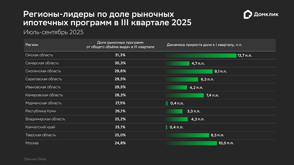 Регионы-лидеры по доле рыночных ипотечных программ в III квартале 2025 года
