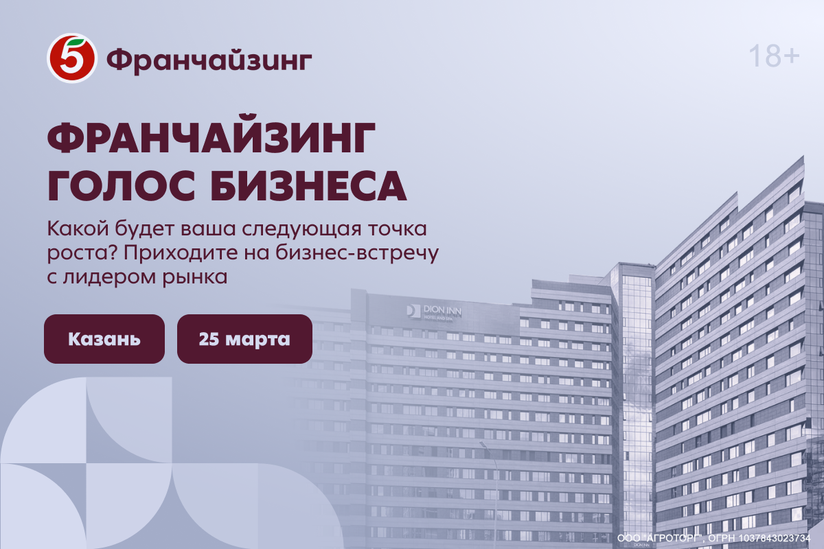 Казань. 25 марта столица Татарстана станет площадкой для масштабной бизнес-встречи «Франчайзинг. Голос бизнеса» (18+), организатором которой выступает торговая сеть «Пятёрочка». Мероприятие соберет владельцев действующего бизнеса, инвесторов и топ-менеджеров из регионов Поволжья, желающих выстроить партнерство с одним из лидеров российского ритейла.