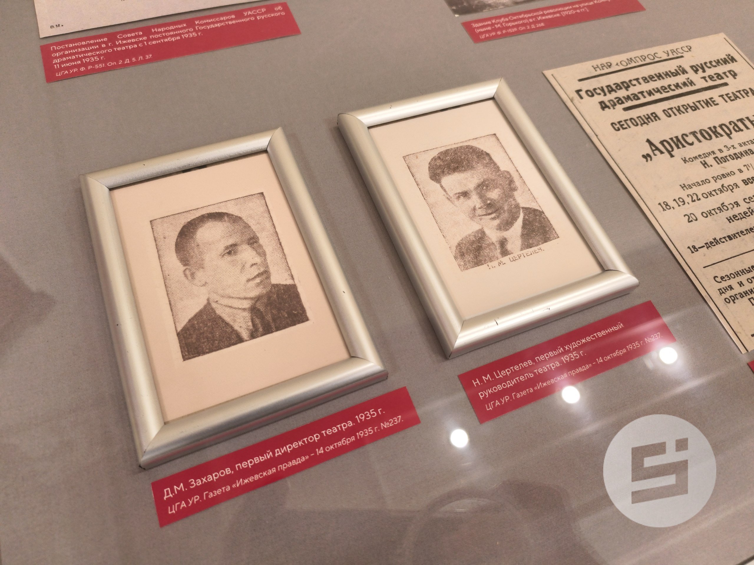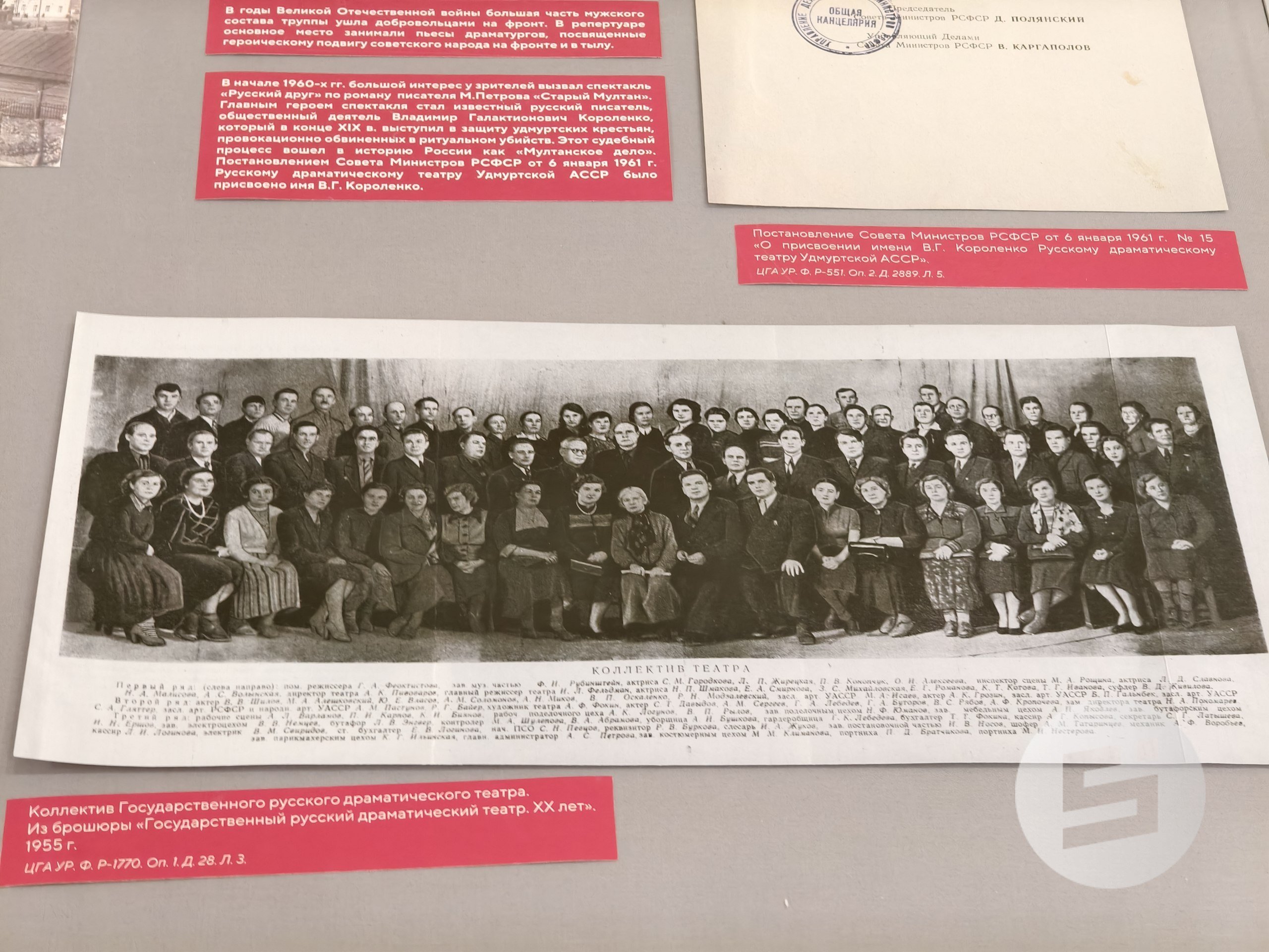 Экспозицию подготовили специалисты Центрального госархива Удмуртии, в котором хранится фонд театра, насчитывающий более тысячи дел. На стендах представлены документы, касающиеся создания театра, в том числе постановление СНК Удмуртской Автономии от 11 июля 1935 года, давшее начало драмтеатру, и первые афиши.