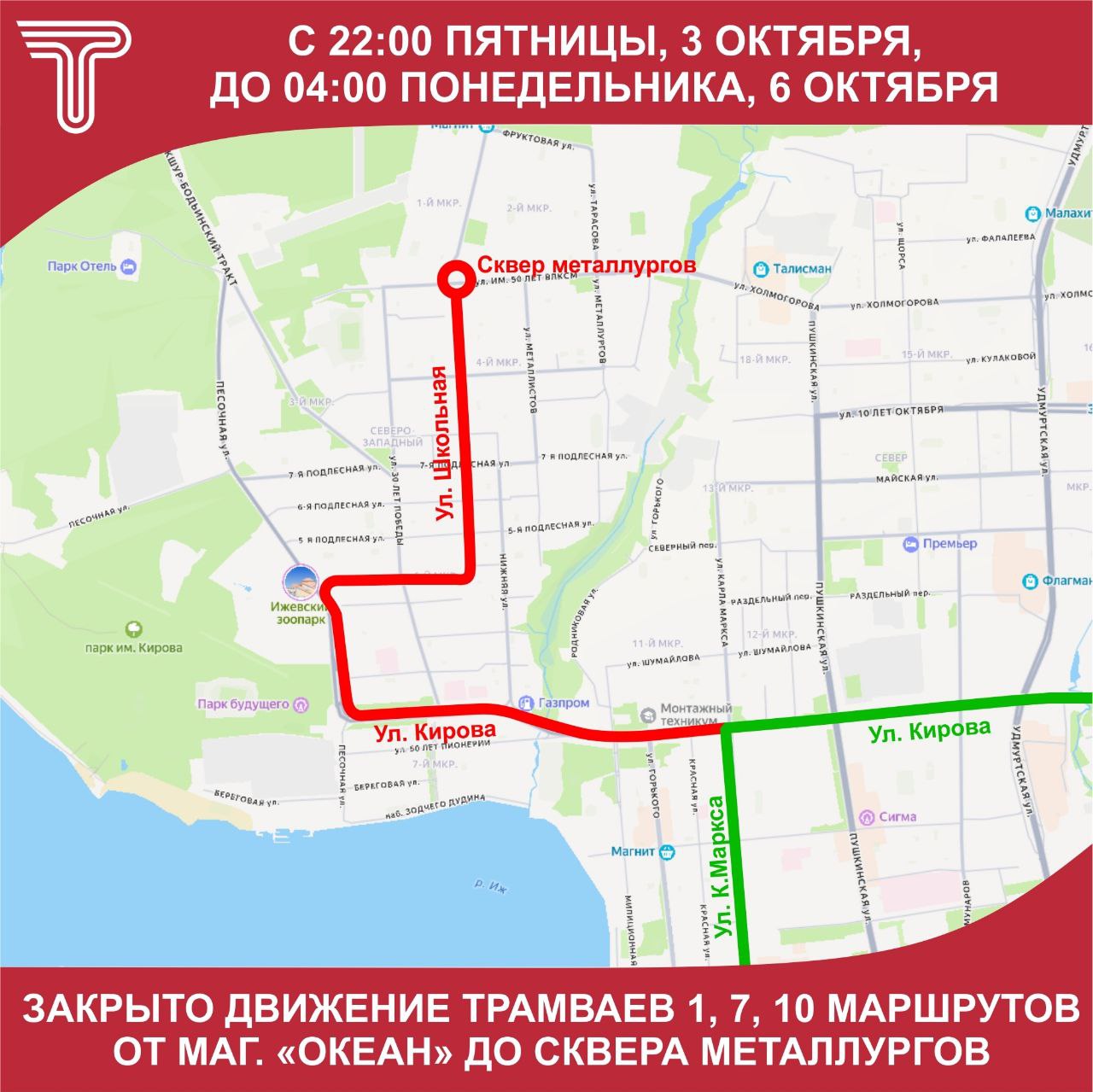 Движения не будет на участке улицы Кирова от магазина «Океан» до Сквера Металлургов с 22:00 пятницы, 3 октября, до 04:00 понедельника, 6 октября. За это время планируют заменить 412 метров одиночного трамвайного пути. Отмечается, что перекрытие движения автомобильного транспорта не будет.