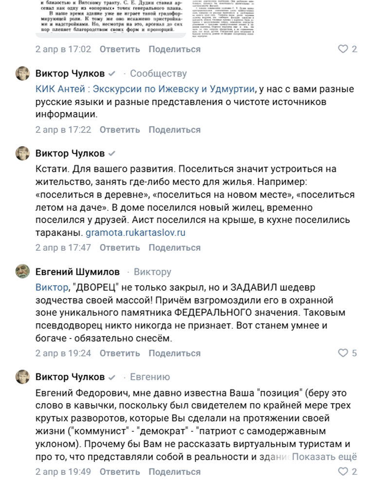 Автор публикации в частности утверждает, что «здание возвели на месте бывшего ложевого цеха завода "Ижмаш" и фактически закрыли подлинный памятник архитектуры — Арсенал оружейного завода». В комментариях основным участником дискуссии выступил бывший пресс-секретарь единственного президента Удмуртии Александра Волкова Виктор Чулков.