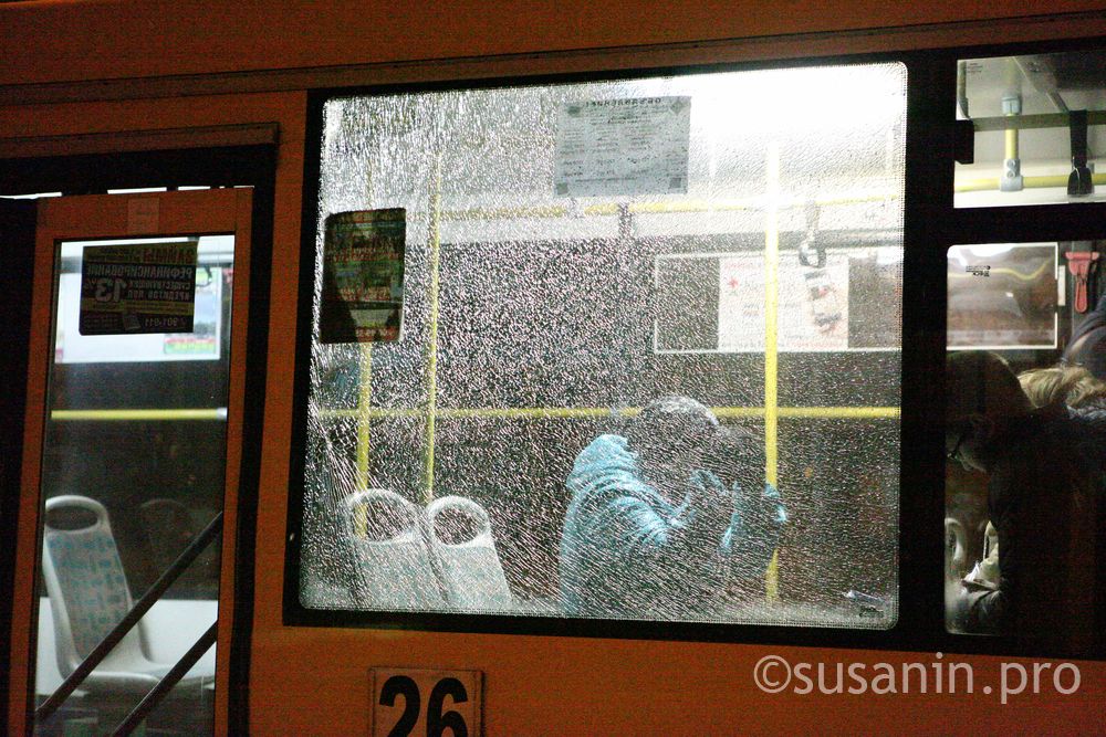 Автобус с поврежденным стеклом простоял на улице Майской несколько часов. Правоохранительные органы пока не сообщают о том, кто и с помощью чего мог нанести повреждения машине.