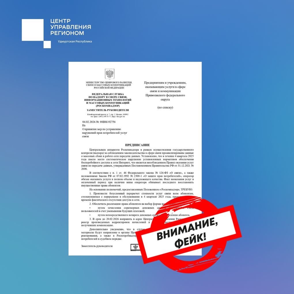 Ижевск. Удмуртия. В Удмуртии опровергли сообщение о том, что Роскомнадзор якобы обязал возместить абонентам убытки из-за отсутствия мобильного интернета в регионе в четвёртом квартале 2025 года. Об этом сообщает Центр управления регионом в Удмуртии.